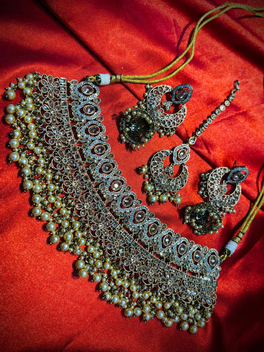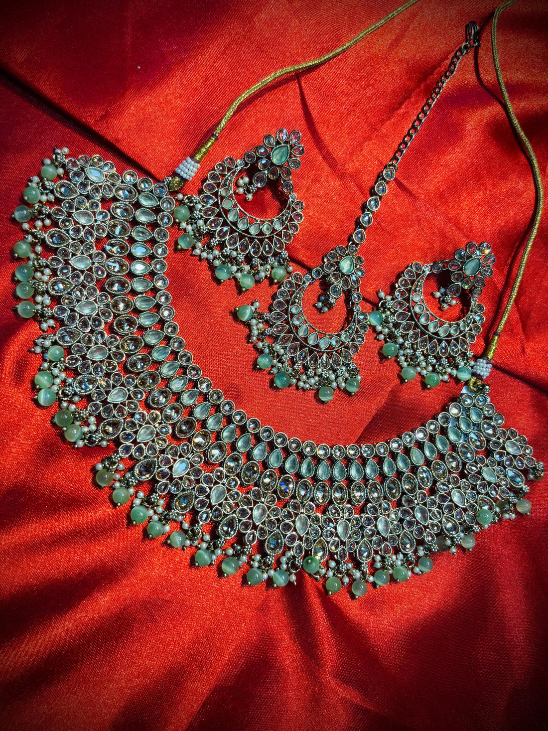 Make your wedding day unforgettable with this luxury bridal choker set featuring shimmering stones. Designed...