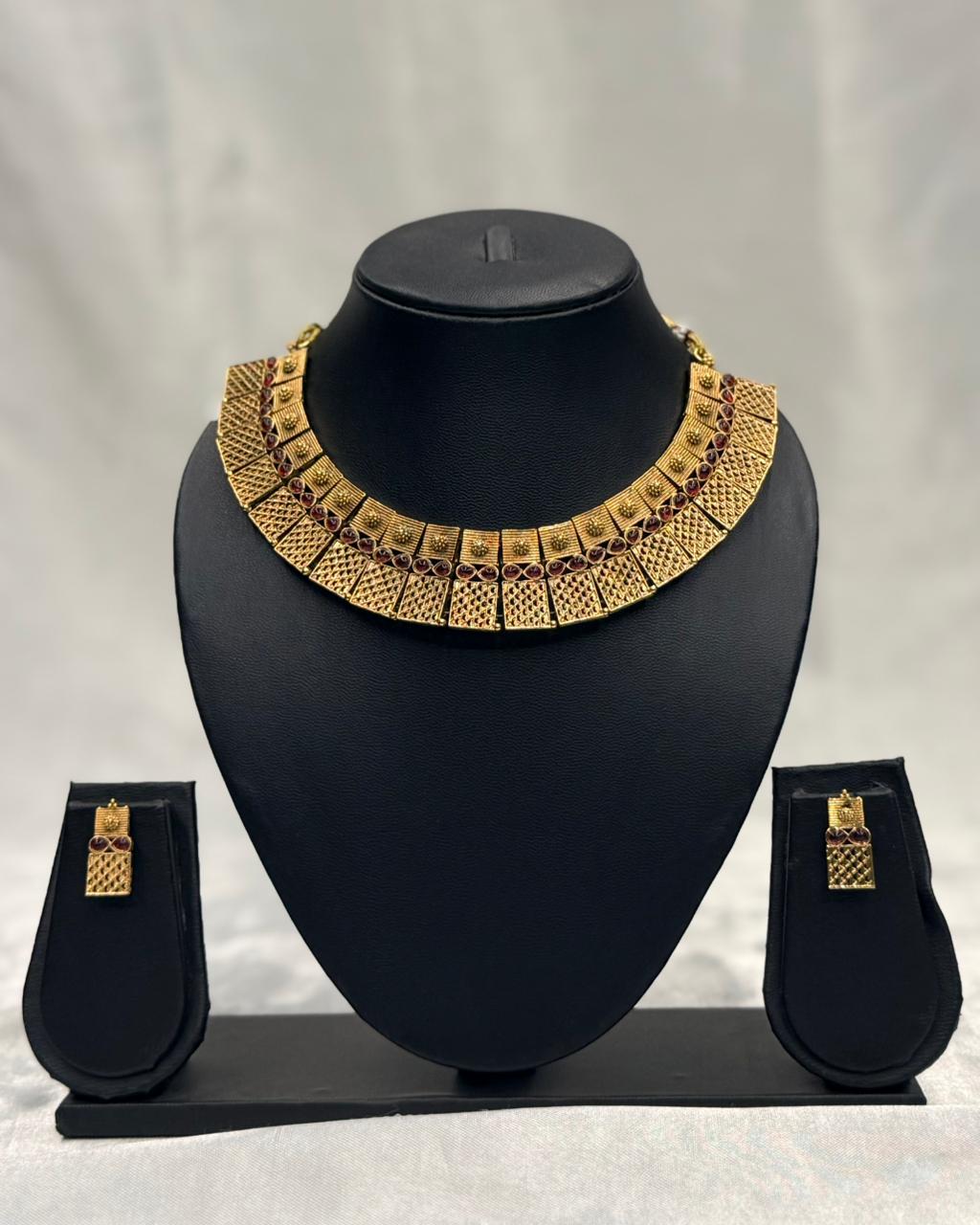 Classic antique finish choker set with ruby accents and matching earrings. Ideal choice for weddings,...