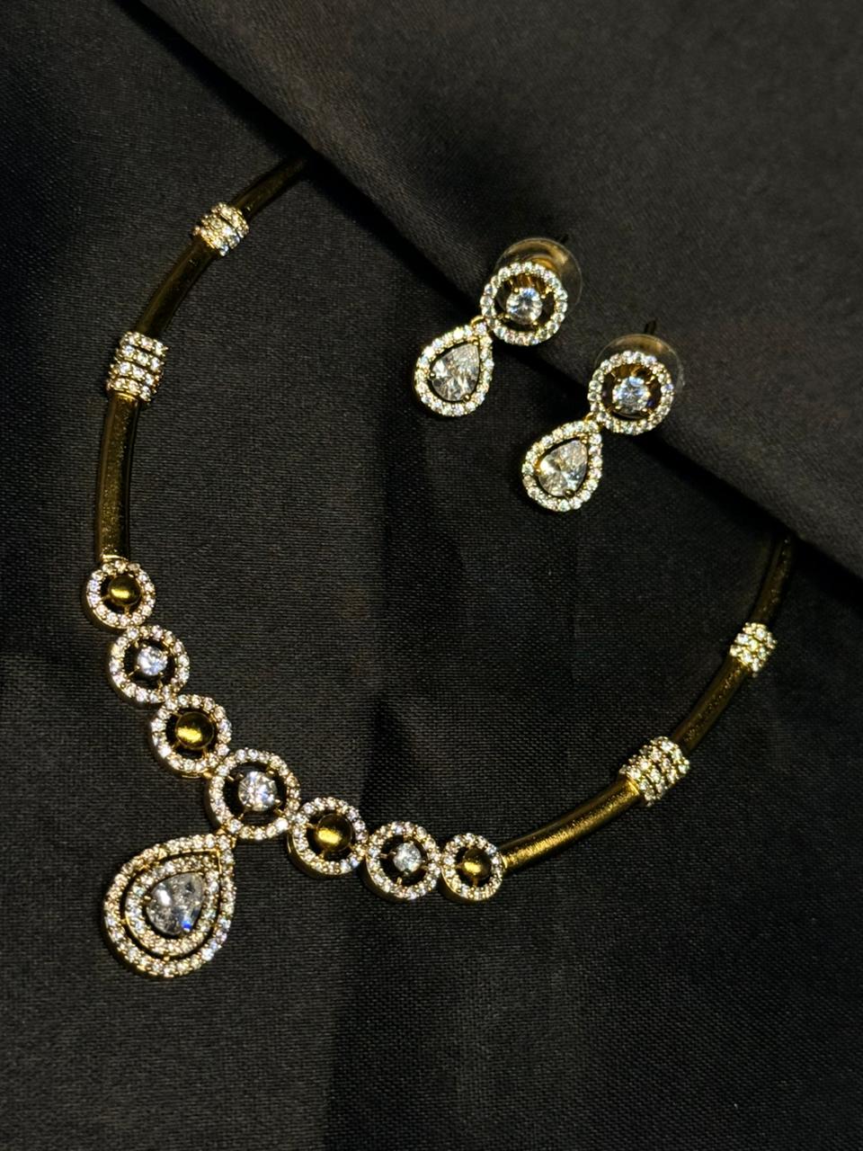 A beautifully crafted gold-finish necklace set featuring sparkling round crystals and a stunning teardrop pendant....